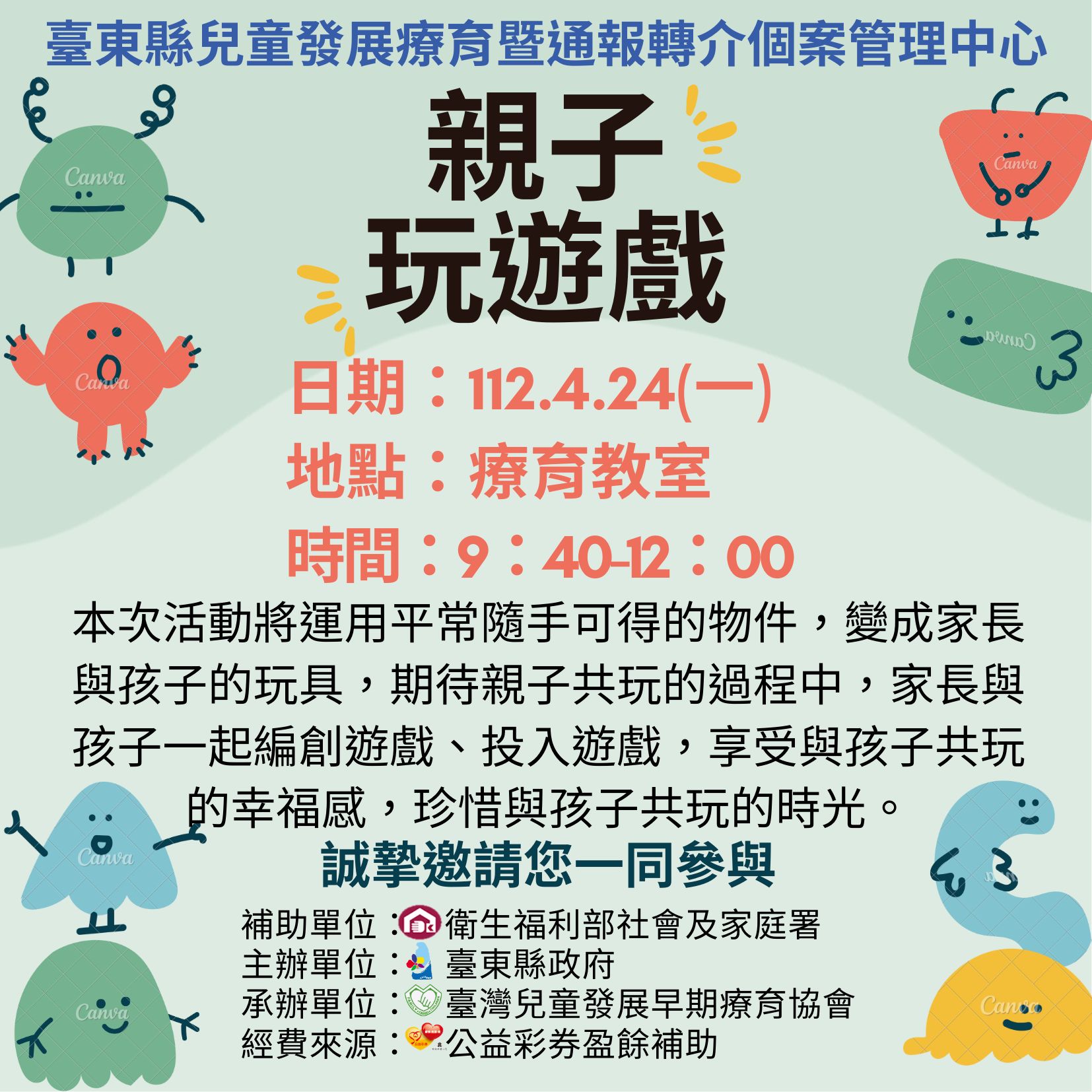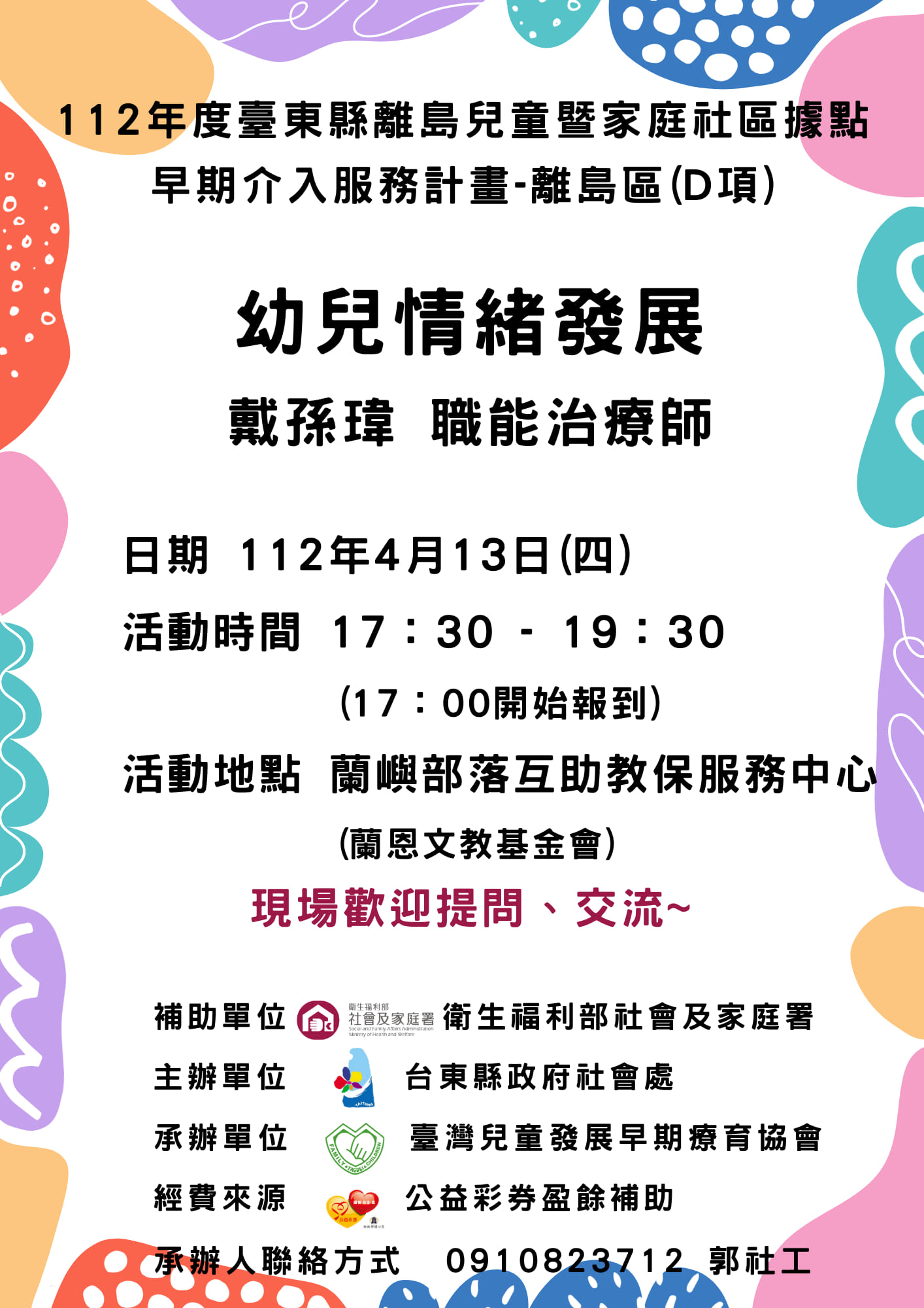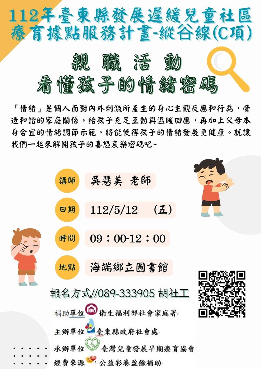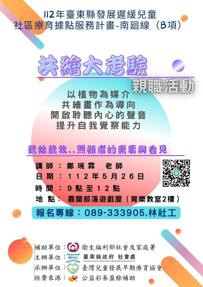 名額有限,要報名要快! 活動日期:113年08月24日(六) 活動時間:上午08:30-12:00 活動地點:蘭嶼部落互助教保服務中心 參與對象:0-6歲兒童、手足及社區家庭 報名截止:08月21日或額滿為止 連絡電話:活動相關資訊洽詢089-333973 打尬/林社工